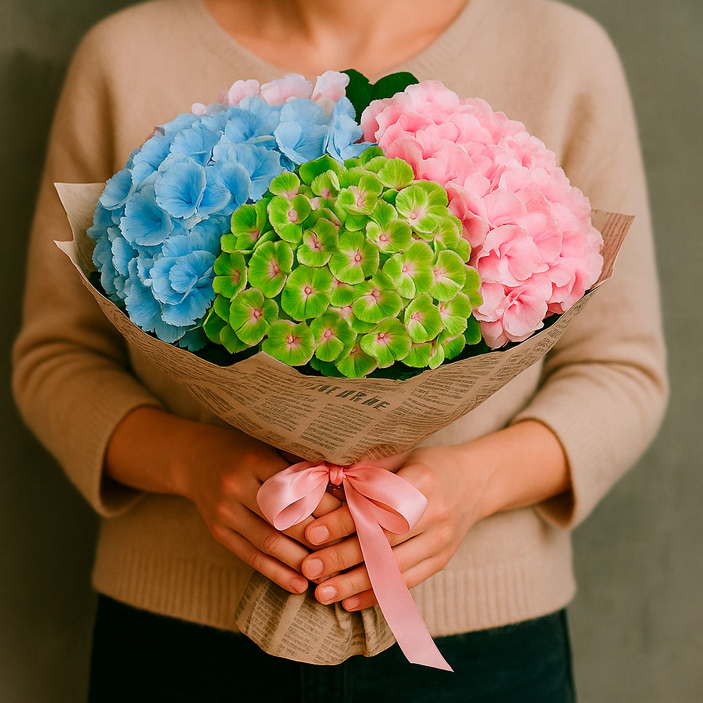 Роскошный микс из розовой, зеленой и голубой гортензии создаёт атмосферу нежности и свежести. Букет оформлен в крафт-бумагу и перевязан атласной лентой. Альтернативно можно использовать матовую плёнку или декоративную сетку. Прекрасный выбор для подарка на день рождения для любимой.