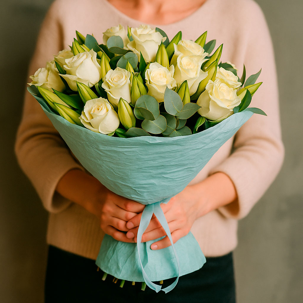 Белоснежные розы и лилии, дополненные нежным эвкалиптом, создают атмосферу утончённости и свежести. Букет оформлен в светло-голубую матовую плёнку и перевязан лентой. Возможна упаковка в крафт-бумагу или декоративную сетку. Прекрасный выбор для годовщины или для любимой.