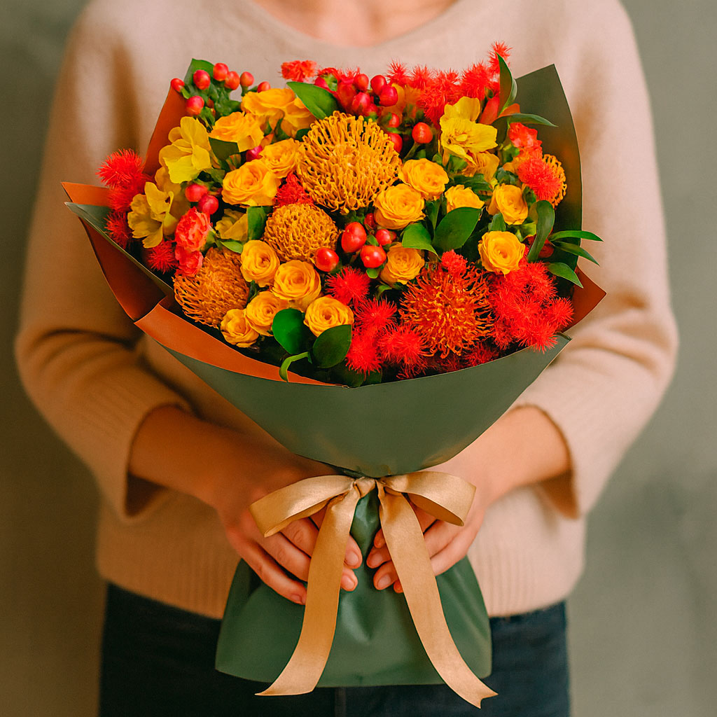 Яркие желтые розы кутсовые и альстромерии сочетаются с экзотическим леукоспермумом и зеленью, создавая эффектный контраст с красными акцентами. Букет оформлен в матовую пленку с изящной лентой. Альтернативные варианты упаковки: крафт-бумага или декоративная сетка. Прекрасный выбор для поздравления на день рождения или для любимой.