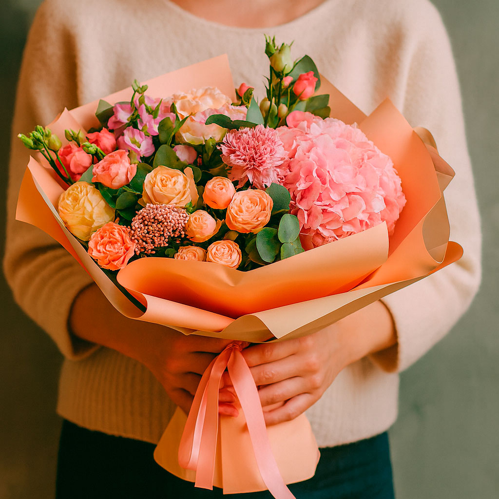 Роскошная композиция из розовой гортензии, кустовой розовой розы, кремовой эустомы, кремовой одноголовой розы, сиреневой маттиолы и эвкалипта создаёт атмосферу нежности и утончённости. Букет оформлен в матовой плёнке и перевязан атласной лентой, что подчёркивает его изысканность. Возможны варианты упаковки с крафт-бумагой или декоративной сеткой. Прекрасный выбор для любимой на день рождения или годовщину.