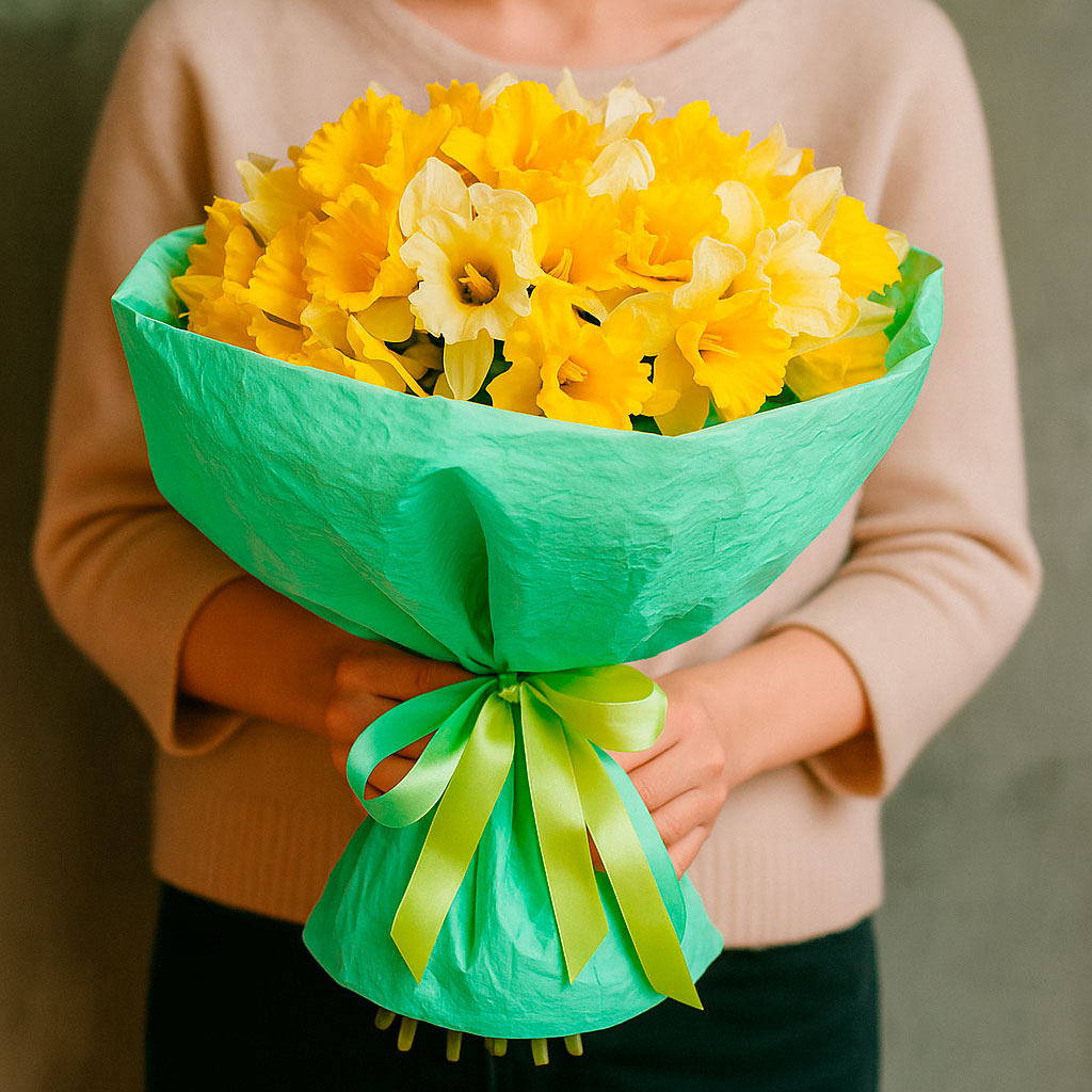 Яркие белые и жёлтые нарциссы создают атмосферу весеннего праздника. Букет оформлен в нежную зелёную матовую плёнку и перевязан атласной лентой. Возможны варианты упаковки в крафт-бумагу или декоративную сетку. Прекрасный подарок для мамы на 8 марта или на день рождения.