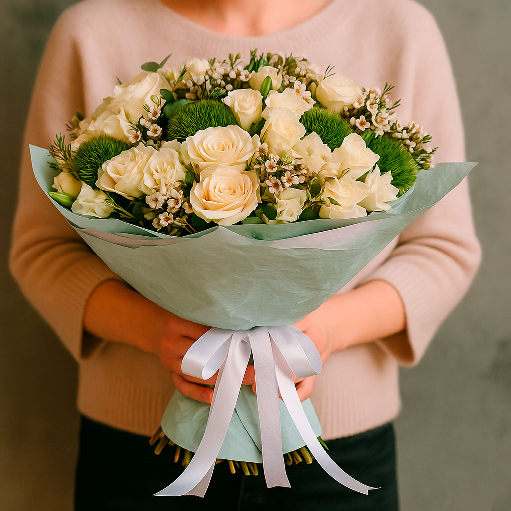 Белоснежные розы и кустовые розы, эустома и зеленая гвоздика диантус создают нежную и свежую композицию. Букет оформлен в матовую пленку и перевязан атласной лентой, что придаёт ему изысканность. Возможны альтернативы упаковки: крафт-бумага или декоративная сетка. Прекрасный выбор для подарка на свадьбу или для любимой.