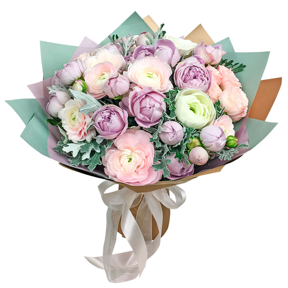 Сиреневые пионовидные кустовые розы и розовые ранункулюсы создают нежное сочетание, дополненное свежей зеленью. Букет оформлен в матовую пленку пастельных оттенков и перевязан атласной лентой. Возможны варианты упаковки с крафт-бумагой или декоративной сеткой. Прекрасный выбор для любимой на день рождения или годовщину.