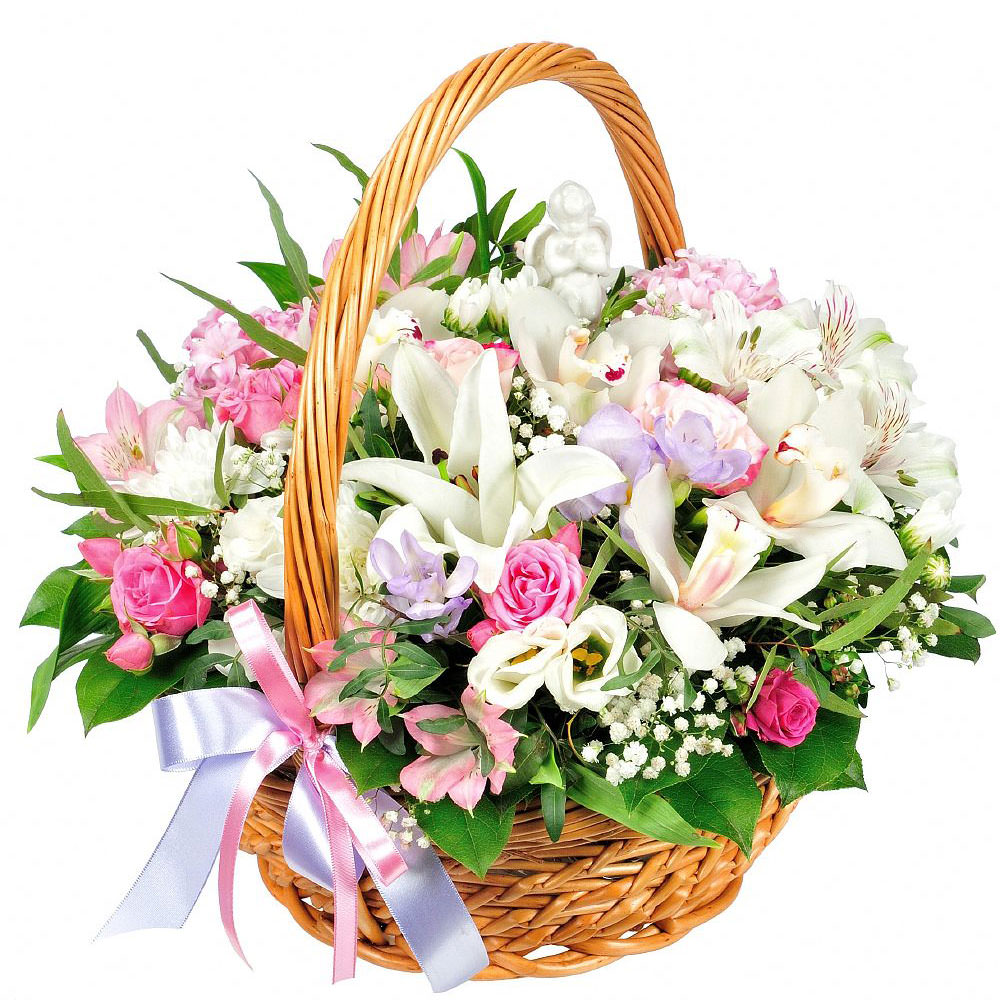 Эта изысканная цветочная композиция включает белоснежные лилии, эустомы, орхидеи и альстромерии, дополненные розовыми кустовыми розами и гипсофилой. Корзина из лозы придаёт аранжировке элегантность, а светло-розовая лента добавляет нежности. Возможны варианты оформления в плетёной корзине или корзине из ротанга. Прекрасный подарок для мамы на день рождения или для любимой на годовщину.