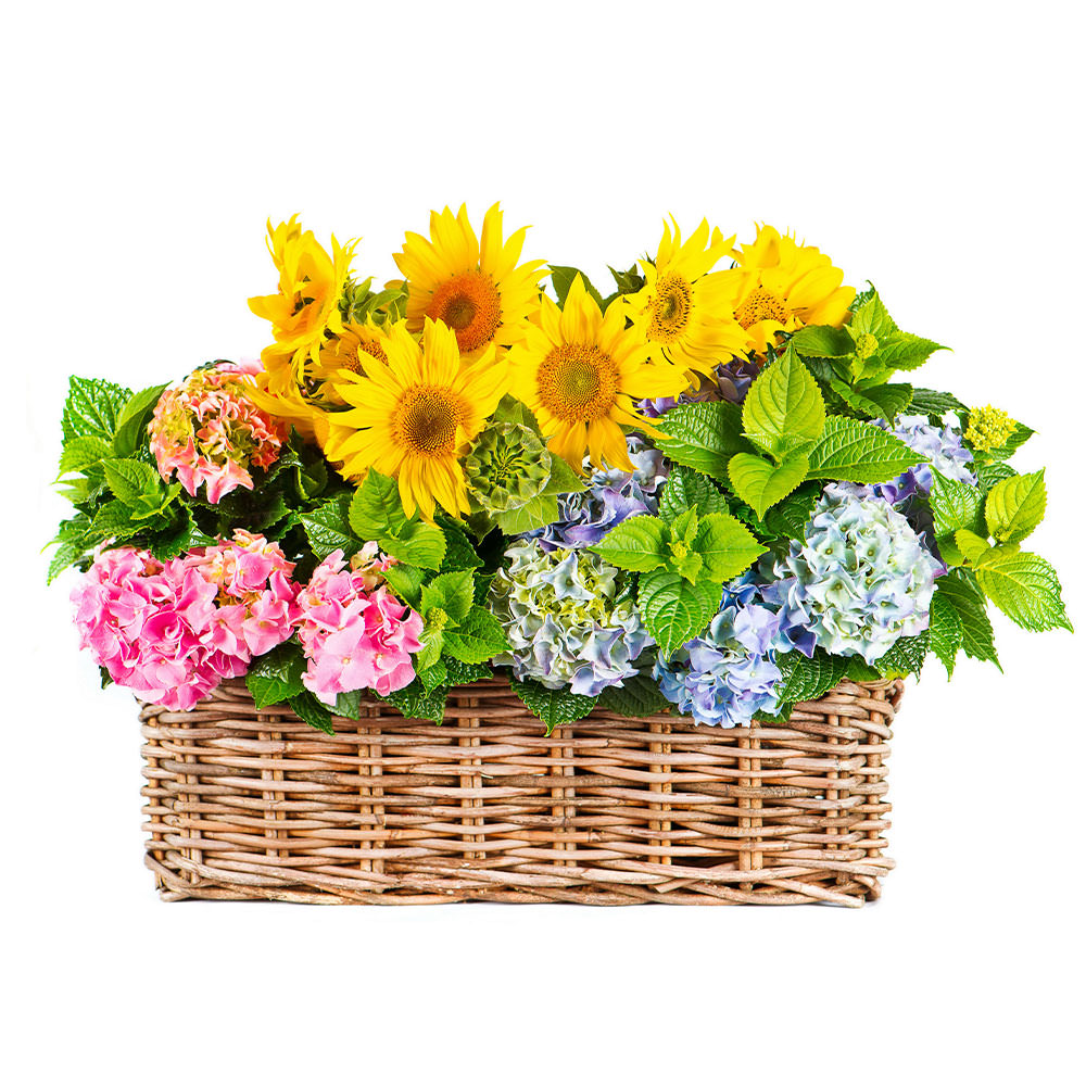 Яркие подсолнухи в сочетании с голубой и розовой гортензией создают атмосферу радости и свежести. Мята добавляет композиции лёгкость и аромат. Цветы расположены в прямоугольной плетёной корзине, что подчёркивает их естественную красоту. Возможны варианты оформления в корзине из лозы или ротанга. Прекрасный подарок на день рождения для любимой или подруги.