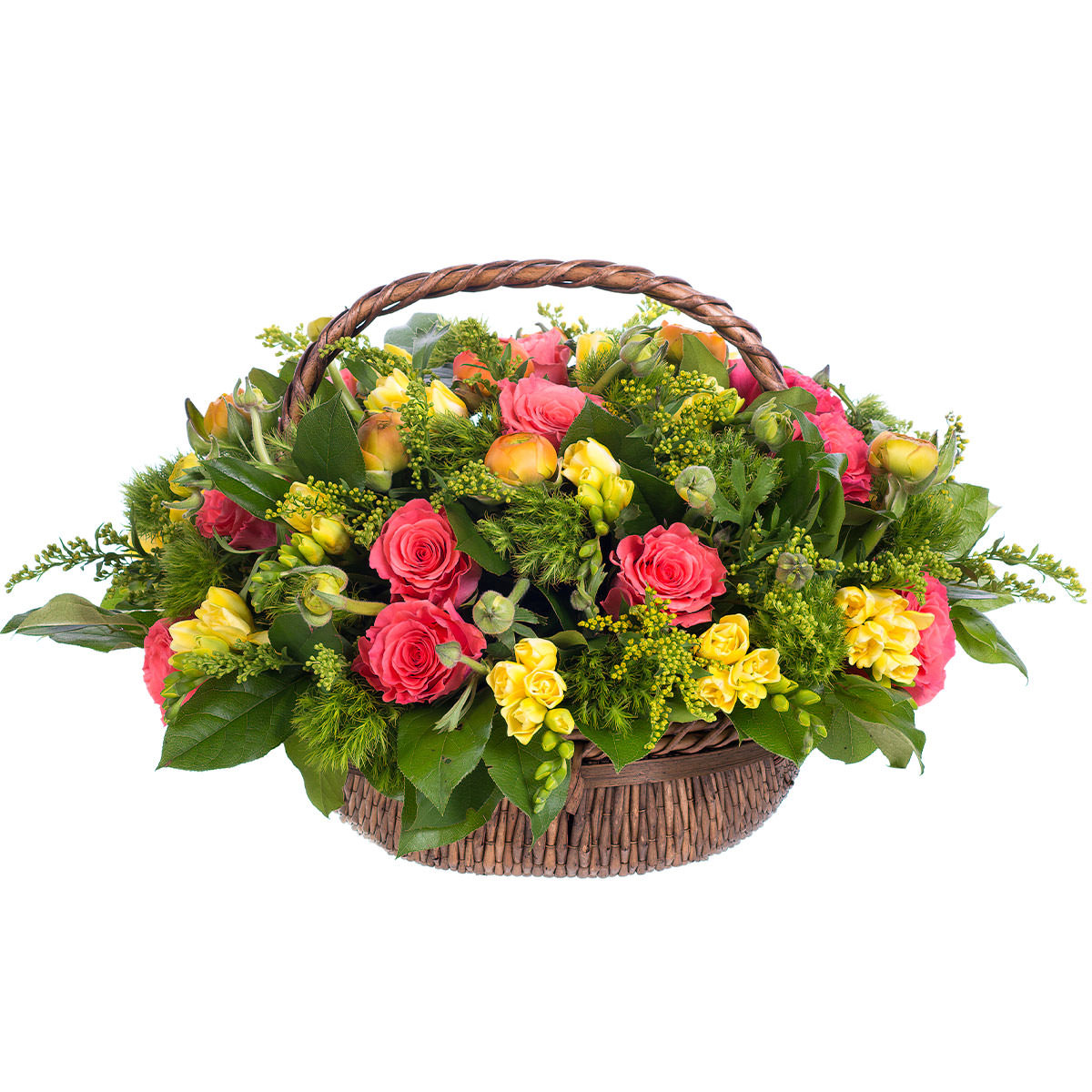 Яркая корзина с розовыми розами, желтыми фрезиями и нежными ранункулюсами, дополненная зеленью и солидаго, создаёт атмосферу весеннего настроения. Корзина из лозы придаёт композиции естественность и уют. Возможны альтернативы оформления: корзина из ротанга или с тканевой отделкой. Прекрасный подарок для любимой на 8 марта или день рождения.