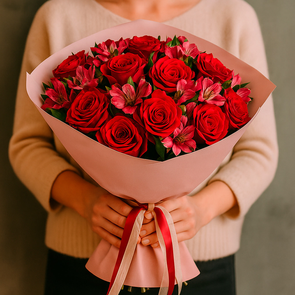 Роскошные красные розы и нежные розовые альстромерии создают гармоничное сочетание в этом букете. Упакован в матовую пленку и перевязан атласной лентой красного цвета. Альтернативно можно оформить в крафт-бумагу или декоративную сетку. Прекрасный выбор для любимой на 14 февраля.