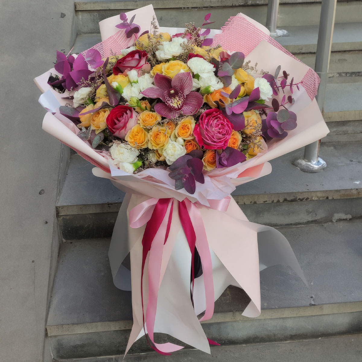 Роскошный букет сочетает в себе розовые орхидеи, жёлтые кустовые розы, розовые одноголовые розы и белые мини-гвоздики, дополненные эвкалиптом. Упакован в матовую плёнку и перевязан атласной лентой. Возможны альтернативы оформления: крафт-бумага или декоративная сетка. Прекрасный выбор для подарка на годовщину или для любимой.