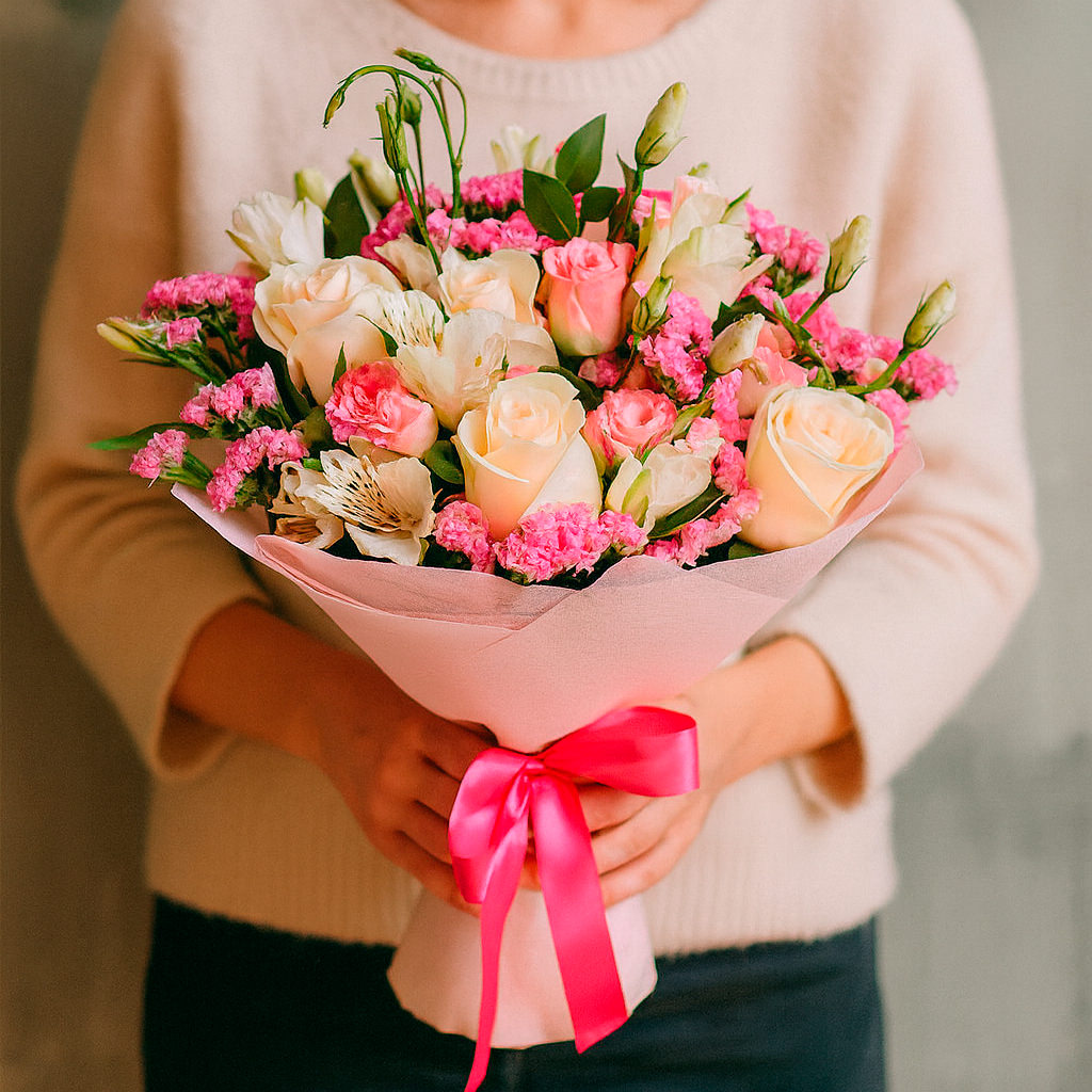 Розовые лизиантусы, кремовые розы и белые альстромерии создают изысканную композицию с добавлением статицы. Букет оформлен в матовую плёнку с яркой атласной лентой. Возможны варианты упаковки: крафт-бумага или декоративная сетка. Прекрасный выбор для подарка на день рождения для любимой.