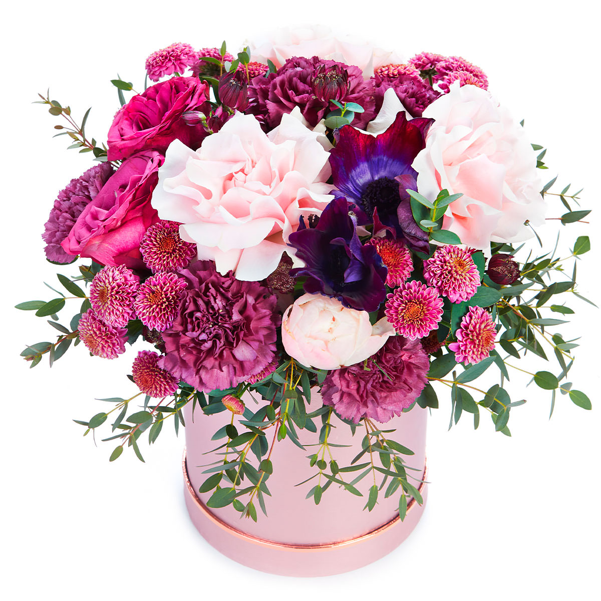 Розовые одноголовые розы, сиреневые гвоздики и бордовые анемоны создают изысканную композицию, дополненную кустовыми розовыми хризантемами и свежим эвкалиптом. Цветы оформлены в элегантной шляпной коробке нежно-розового цвета. Альтернативные варианты упаковки: бархатная коробка или коробка с принтом. Прекрасный подарок для любимой на день рождения или годовщину.