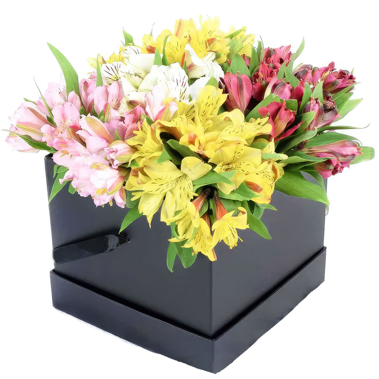Яркие альстромерии в желтых, розовых и красных тонах создают атмосферу весеннего праздника. Композиция оформлена в элегантной черной квадратной коробке, подчеркивающей насыщенность цветов. Возможны варианты оформления в бархатной или дизайнерской коробке. Прекрасный подарок для любимой на 8 марта или на день рождения.